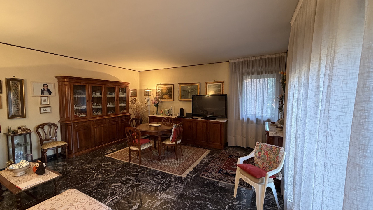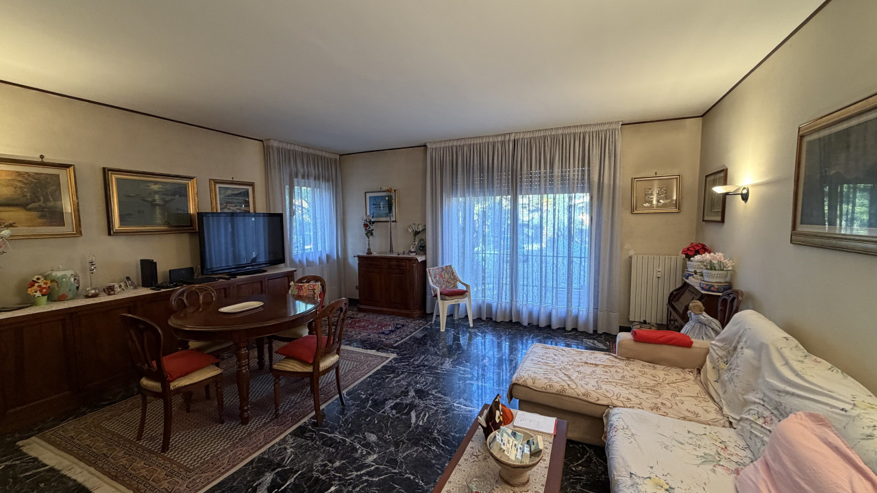 L'ingresso elegante si apre su ambienti curati nei minimi dettagli: il luminoso soggiorno doppio è impreziosito da grandi finestre che affacciano sul verde condominiale e pavimenti in marmo scuro che donano prestigio all'ambiente; la cucina abitabile separata dispone di arredi su misura in legno massello, ampio spazio per pranzi conviviali e accesso diretto al terrazzo coperto perfetto per momenti di relax.